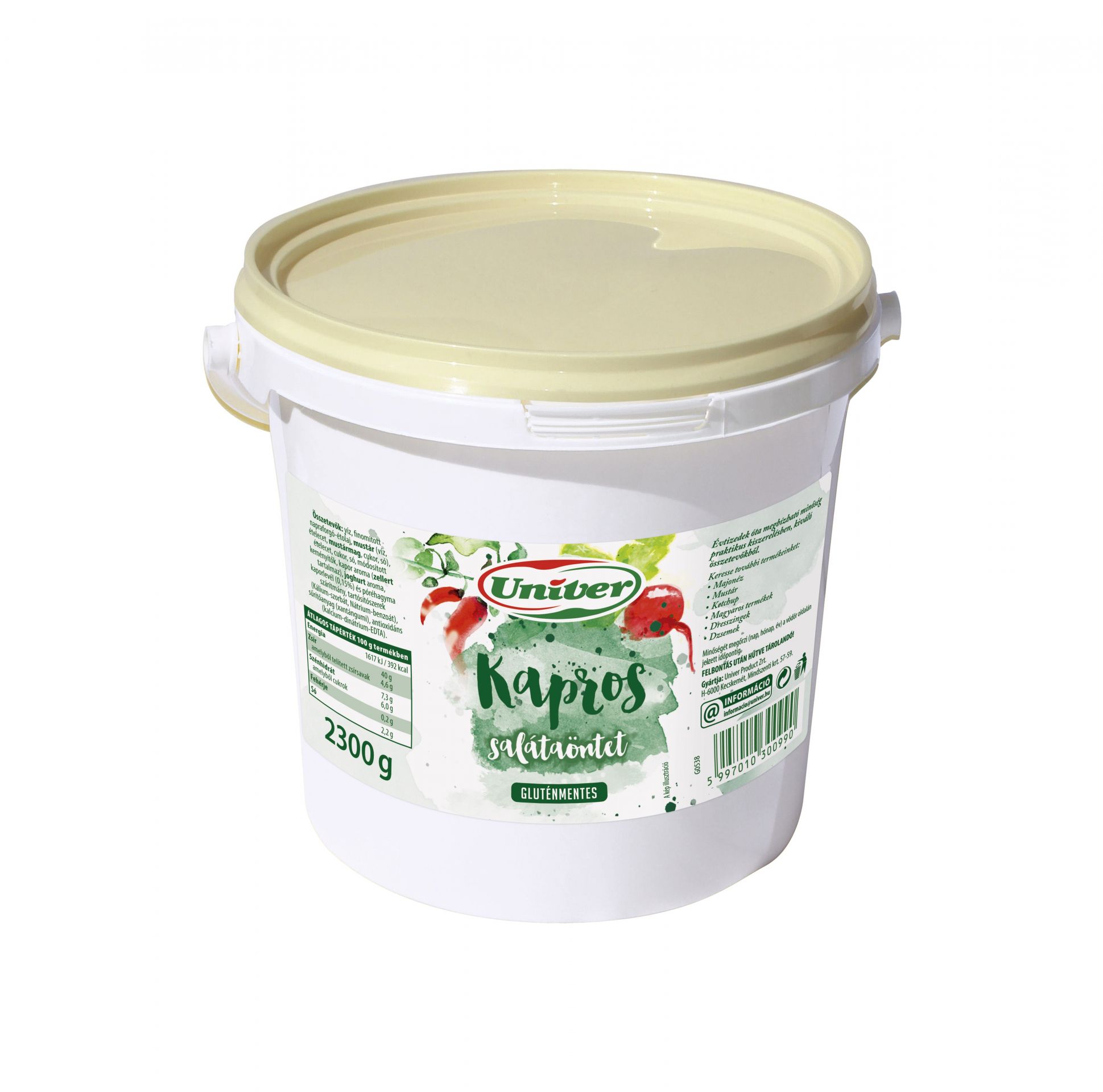Csomagolás mérete: 2,3kgIvóvíz, Napraforgó étolaj, Mustár (ivóvíz, ételecet, mustármag, cukor, étkezési só), Ételecet, Cukor, Étkezési só, Módosított keményítők, Kapor aroma ( zellert tartalmaz), Joghurt aroma, Kaporlevél (0, 15%) és póréhagyma szárítmány, Tartósítószerek (kálium-szorbát, nátrium-benzoát), Sűrítőanyag (xantángumi), Antioxidáns (kalcium-dinátrium-EDTA)