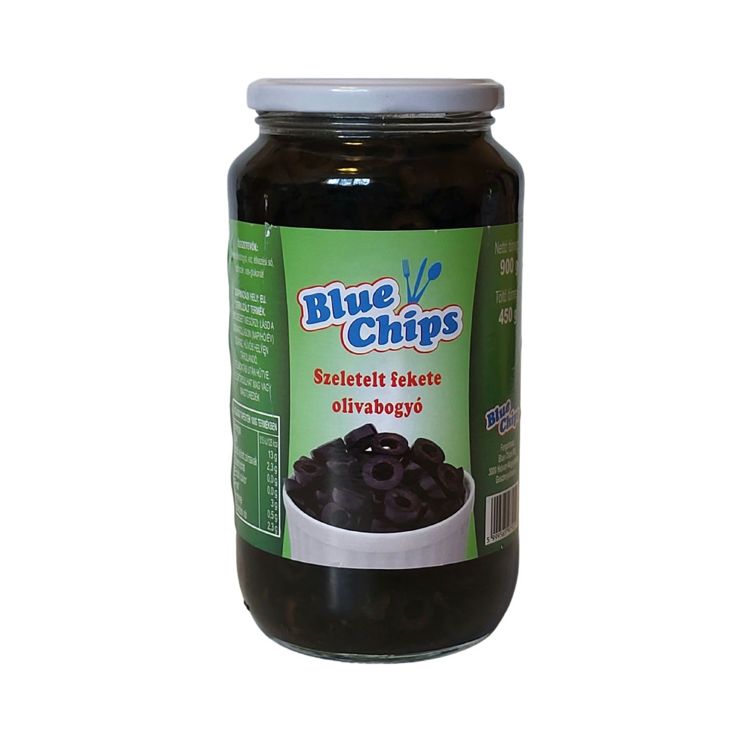 Fekete olivabogyó, víz, étkezési só, színezék: vas-glukonát